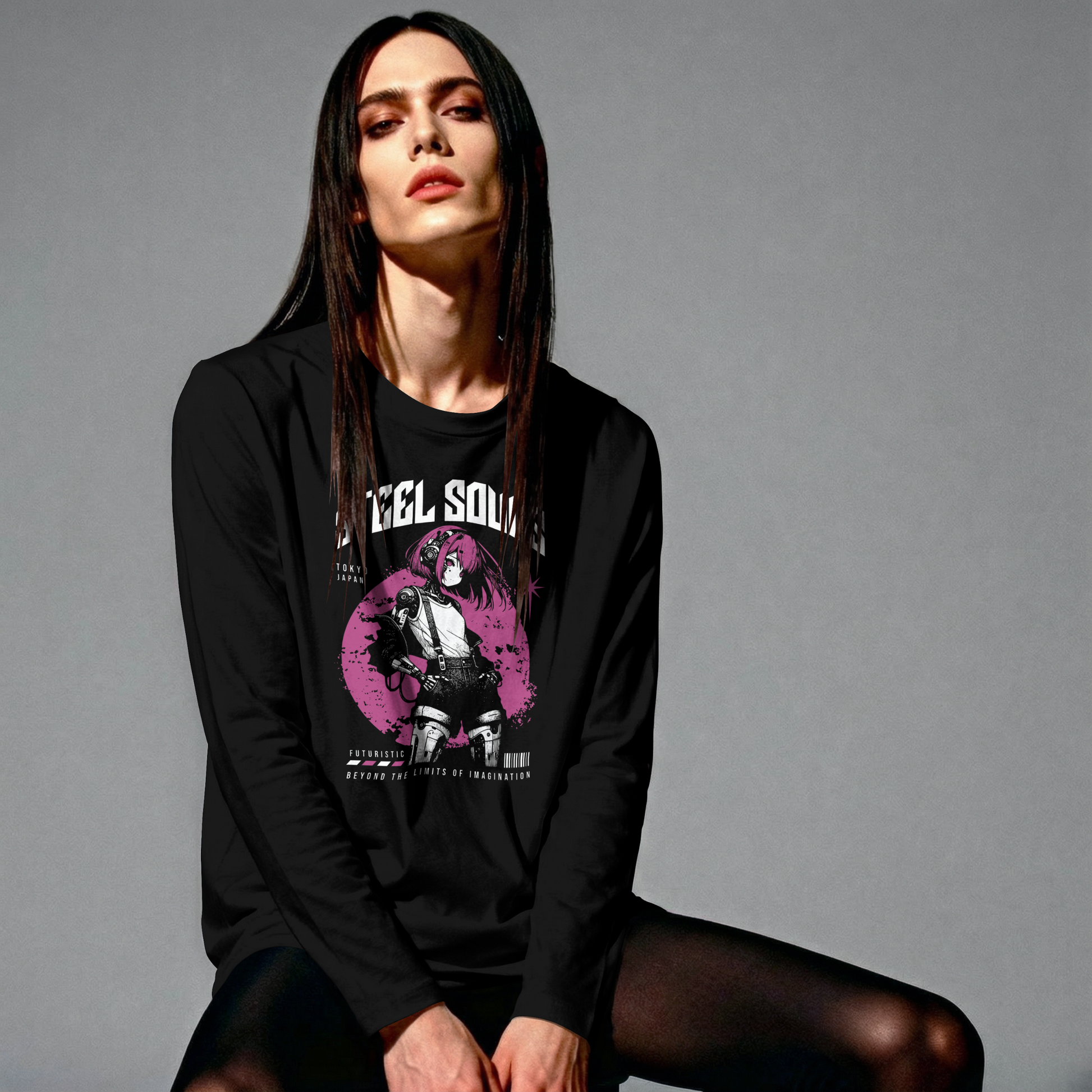 Step into the future with our longarm unisex t-shirt featuring a stunning retro cyborg anime girl design! This premium black t-shirt is perfect for anime enthusiasts and those who appreciate unique, high-quality fashion. Crafted from 100% combed ring-spun cotton, it provides a soft and comfortable feel, making it an ideal choice for any casual occasion.